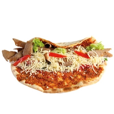 Knapperige Turkse pizza belegd met gekruid gehakt en gesmolten geraspte kaas, gevuld met mals, gekruid kalfdonervlees, frisse salade en huisgemaakte saus naar keuze.
