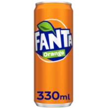 Verfrissende, bruisende sinaasappelfrisdrank (Fanta Orange, 330 mL blik).